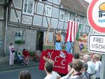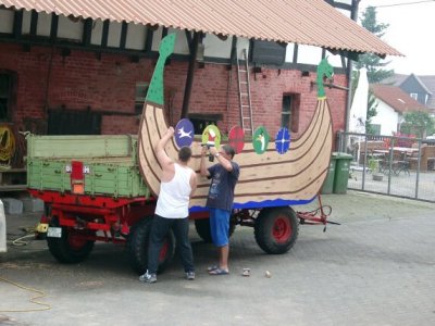 Gallery Jahr 2002 - Aktivitäten außerhalb der Session Heimatfest 2002 Festumzug Jörn Langenegger und Ralf Meise verwandeln Kesten's agrartechnisches Gerät in ein Wikingerschiff.